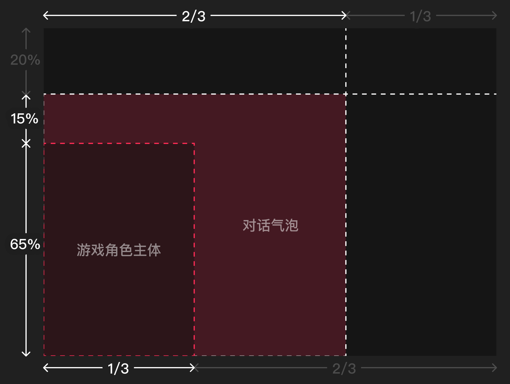 - 游戏对话气泡:展示在画面左侧2/3区域,高度为画面高度80%,避开游戏主要行动按钮(开始游戏);