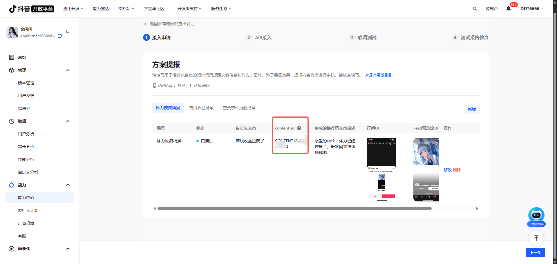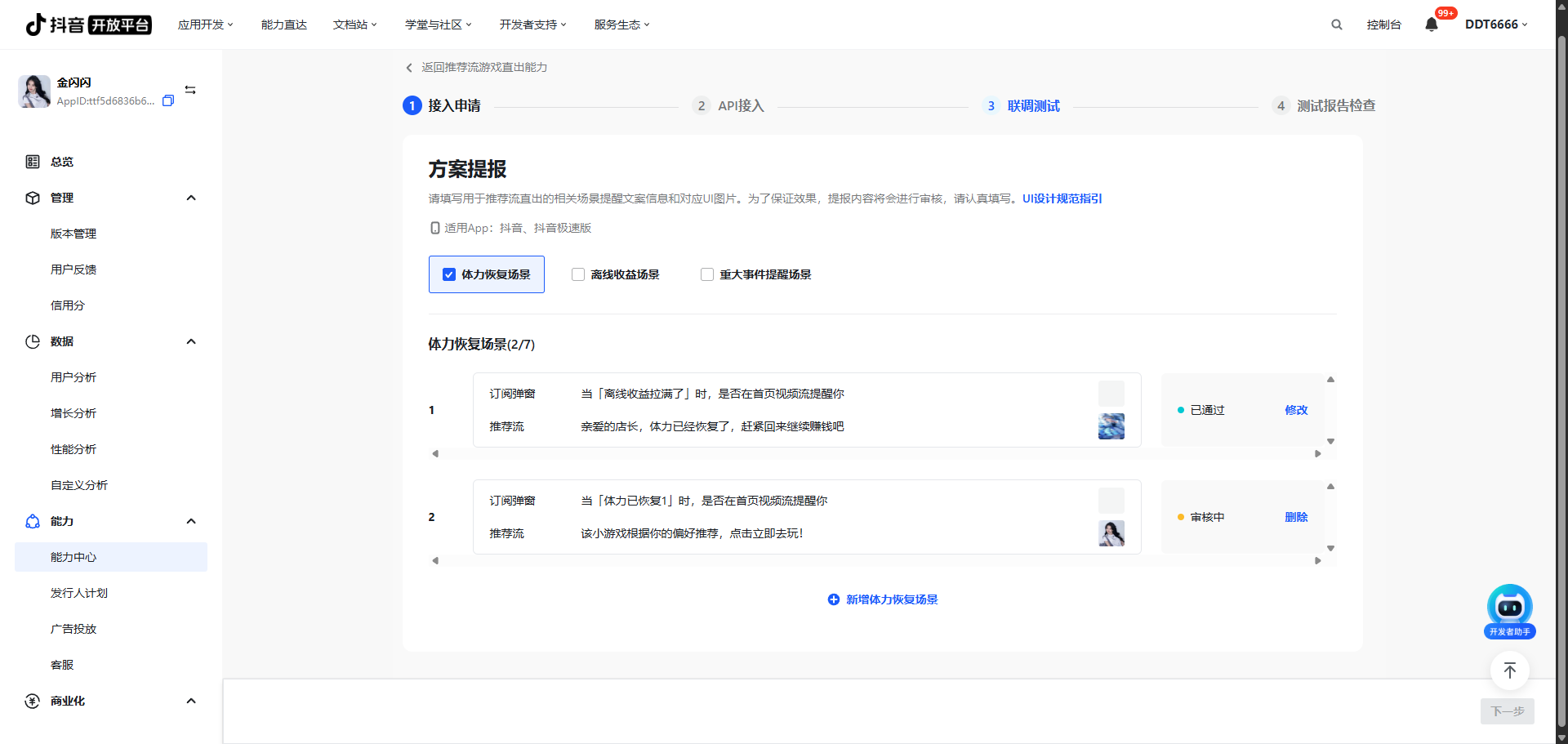 2)在抖音推荐流展示的文案+UI(含游戏内的气泡提醒) - Step 3:配置完成后,可提交审核;