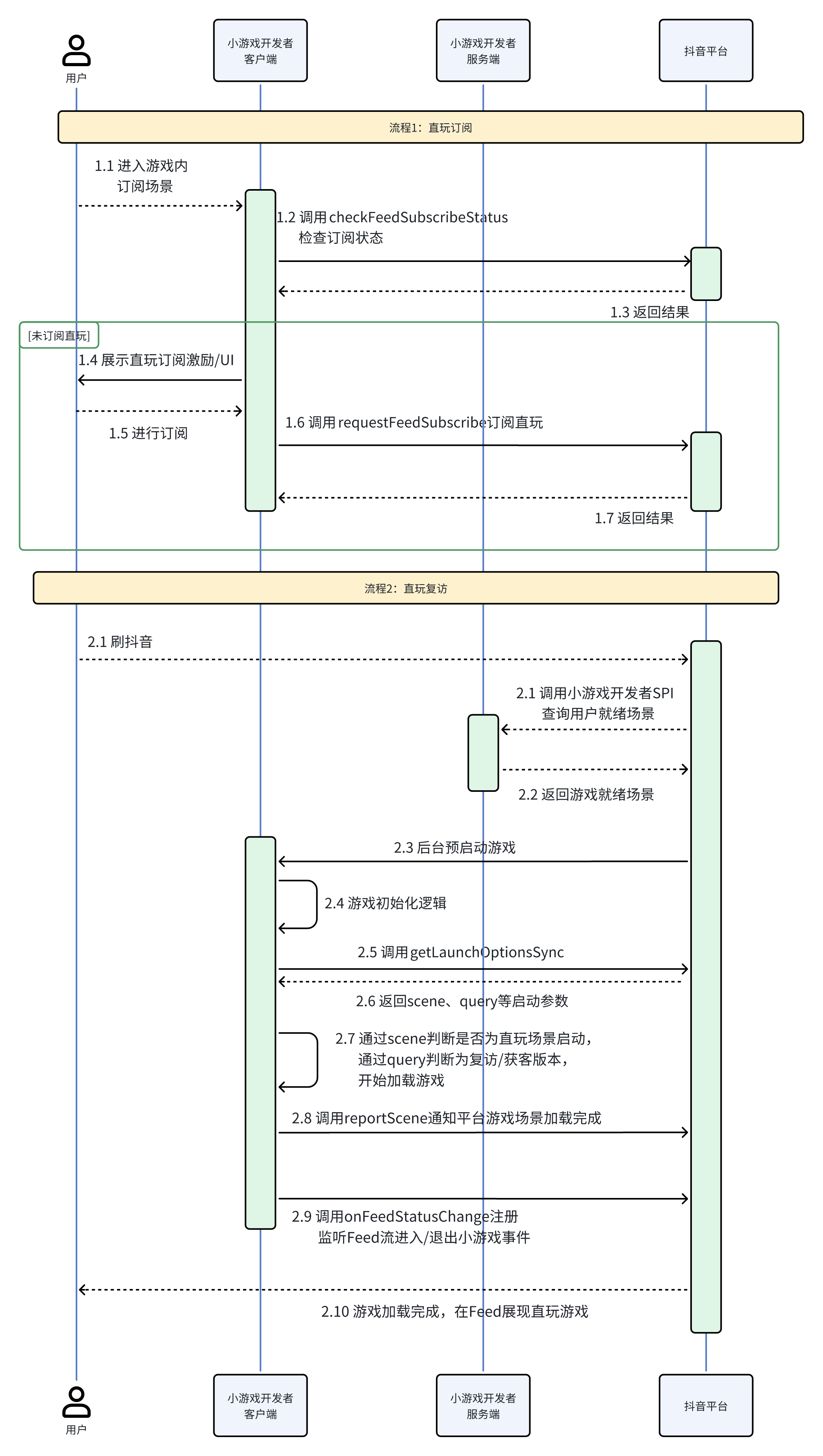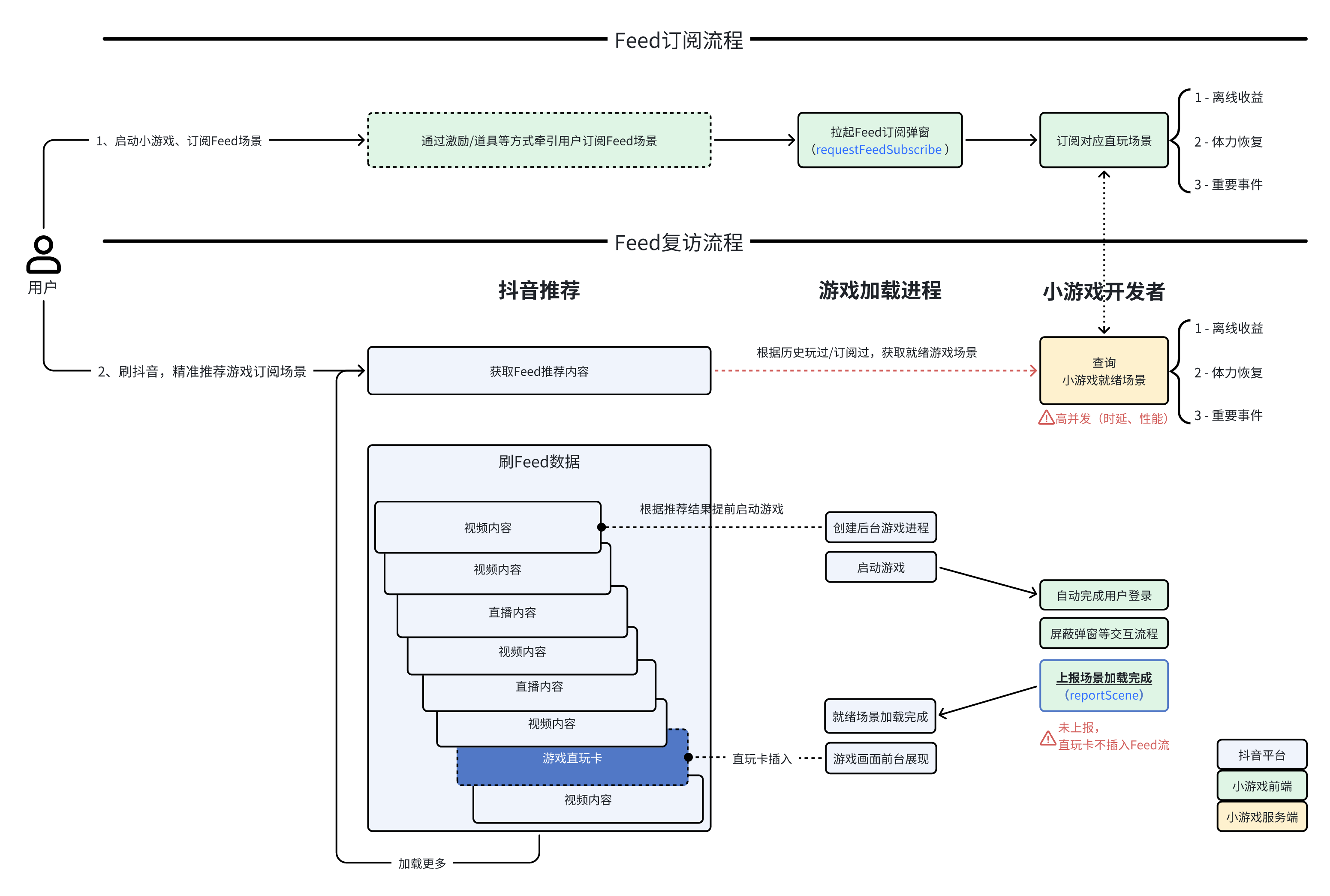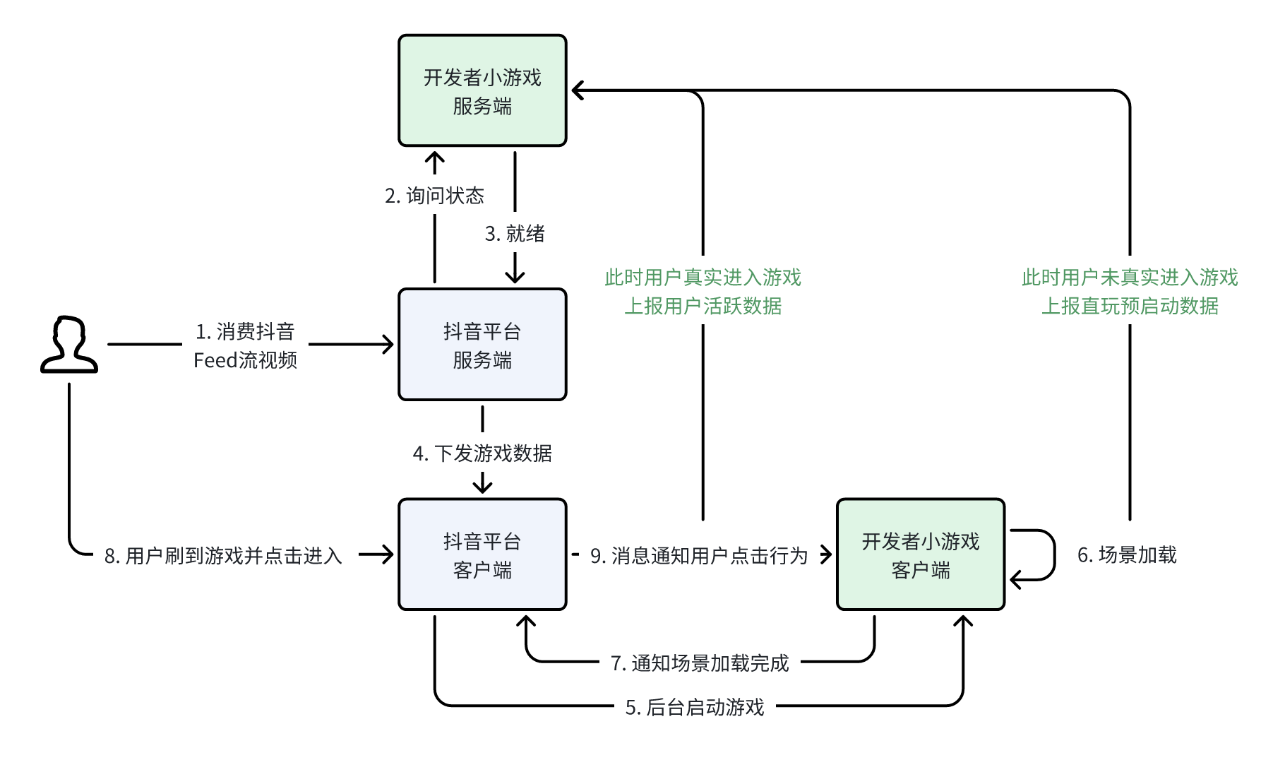 - 无缝衔接体验:基于小游戏容器预加载能力,将预加载完成的游戏在推荐流中分发给用户,实现抖音推荐流无缝进入游戏的交互体验。