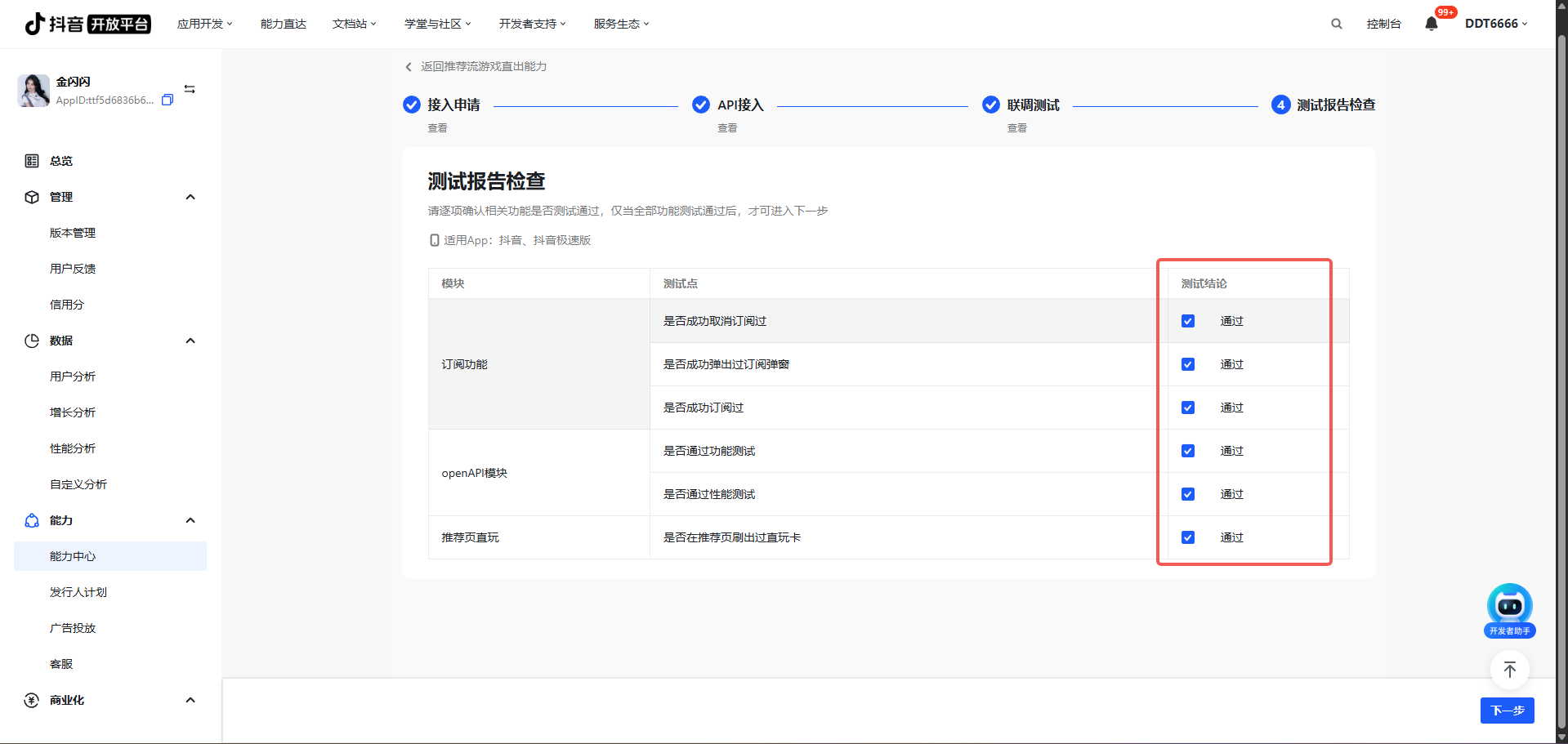 - Step 2:开发者需根据实际的测试情况,勾选确认已完成该测试项的测试;