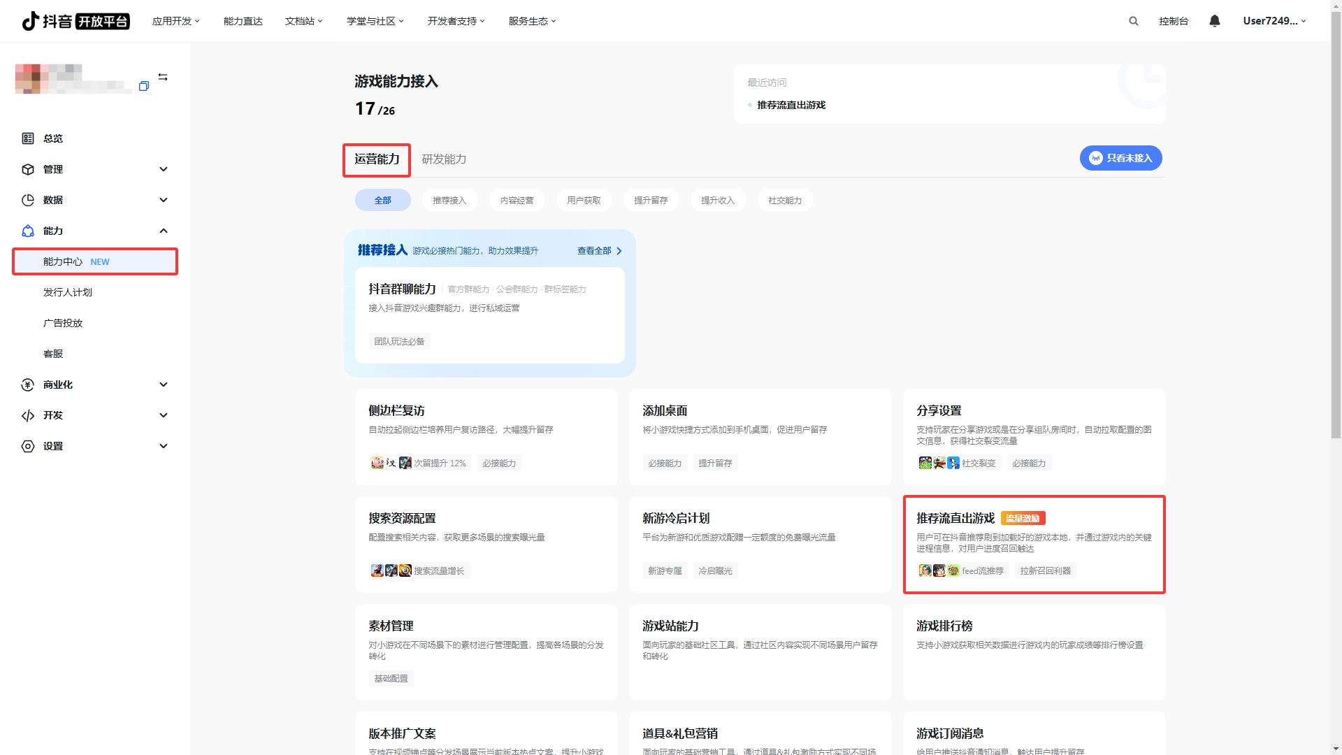 - Step 2:进入「运营能力」模块,点击「推荐流直出游戏」;