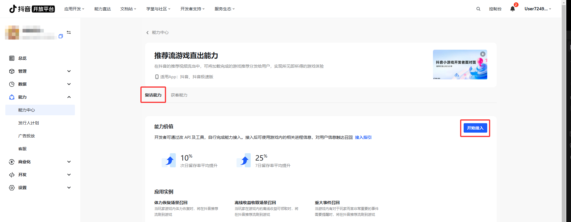 - Step 3:进入「推荐流游戏直出能力」页面,选择「复访能力」页签;