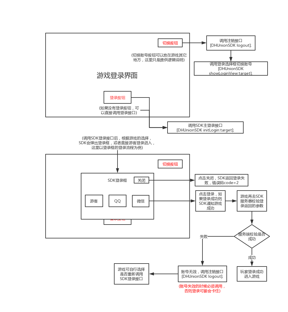 SDK登录成功返回用户accountid,token等信息后,游戏还需要去服务端校验这些信息,如果检验失败,需要调用SDK的logout接口,再根据情况重新调用SDK的登录接口,以防出现一直登录不上的问题。